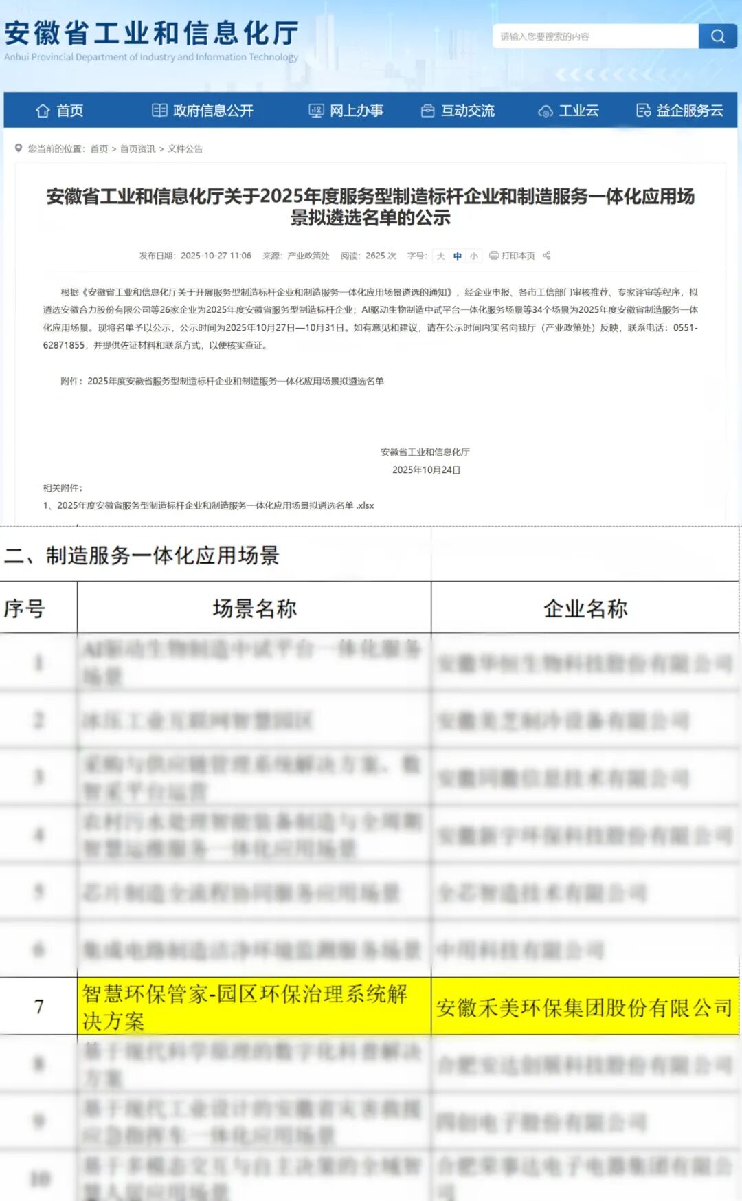 近日,安徽省工業和信息化廳公布了2025年度服務型制造標桿企業和制造服務一體化應用場景遴選名單,禾美環保申報的“智慧環保管家-園區環保治理系統解決方案”入選20